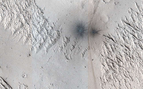 NASAの火星偵察軌道船の高解像度画像科学機器(HiRISE)カメラは、これまでに初めて人工知能(AI)によって発見された火星のクレータ集団のこのイメージをとった。AI は、軌道船のコンテキスト(概況)カメラでとられたイメージに、このクレータを見つけた。科学者達は、クレータを確かめるために、この HiRISE イメージでフォローアップした。このクレータのコンテキストカメラの視界には、AI によって発見された火星のクレータの集団を見ることができる。これらのクレータは一つの流星のいくつかの片によってつくられた。クレータで最も大きなもは幅約4メートルである。クレータは、合計で、赤い惑星の表面約30メートルに広がっている。このクレータは、ノクティスフォッセ(Noctis Fossae)と呼ばれる領域に発見された。