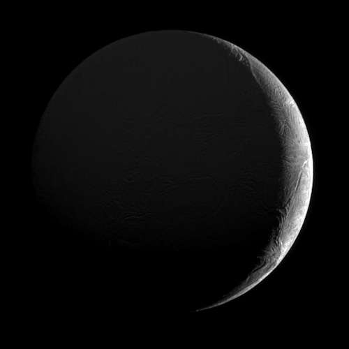 土星の月差渡し504キロメートルのエンケラドゥスの弱々しい三日月に沿った日光の低い角度が、その氷の地表の多くの破砕と溝を映し出している。この視界はエンケラドゥスの土星に面する半球をに向かい、土星から反射される日光によって微かに照らされている。エンケラドゥスの北は左上14度である。このイメージは、エンケラドゥスから約 168,000 キロメートルで、2016年12月26日に、NASAのカッシーニ宇宙船の狭角カメラの可視光線でとられた。イメージスケールはピクセル当たり1キロメートルである。