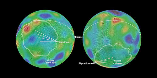 NASAのカッシーニミッションからの画像データで働く研究者達は、土星の月エンケラドゥスの最初に赤道に近かった地域が極に再配置され、逆転したかもしれないという証拠を発見した。この現象は「真の極のさまよい(true polar wander)」として知られている。研究者達は、エンケラドゥスの表面全体に、それぞれ、もしこの月の回転軸が緯度約55度で再方向付けされたかもしれない、赤道と極を結んだ窪みのペアに沿って窪みのチェーンを発見した。これらのマップは、高低を表す色で、この氷の月の南半球の方を見ている。紫は最も低い高度を、赤は最も高いところを表している。左の図は、何百万年も前の可能性がある古代の方向の、エンケラドゥスの地表を示している。最初の南極周辺の低い領域に加えて、赤道に沿って走る地形の低部を表す窪みのチェーンを青と紫で見ることができる。長い線形の「タイガー・ストライプ」の破砕を持つこの月の現在活動的な南極を囲むこの領域は赤道の南の中央緯度にあった。右の図はエンケラドゥスの現在の方向を示している。