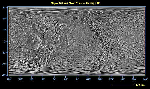 土星の月ミマスのこの広域なマップは、カッシーニ宇宙船の接近通過の間にとられたイメージを使ってつくられた。この月の大きな際立ったクレータ、ハーシェルは、このマップでは左に見える。このマップは赤道でピクセルあたり216メートルのスケールを持ち、このマップの投影のために使われているミマスの平均半径は 198.2 キロメートルである。このマップの解像度は、一度にあたり16ピクセルである。この製品は、2012年8月(PIA14926を見る)に発表されたマップの最新版である。この最新情報には、2016年11月と2017年2月の2回の接近飛行からの新しいイメージによるこの月の表面の約半分を含んでいる。この月の西の半球、南極、東半球の部分には、このバージョンで最新情報を受けた。