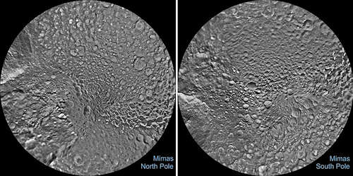 土星の月ミマスの南北の半球が、最良のカッシーニイメージからモザイク化されたこれらの極立体画法マップに見られる。それぞれのマップは極の一つに中心を置き赤道に及んでいる。グリッドラインは緯度と経度を30度増で示している。これらのマップのフルサイズのバージョンはピクセル当たり216メートルである。このマップの解像度は1度当たり16ピクセルである。これらのマップの投影に使われたミマスの平均半径は 198.2 キロメートルである。このマップは2012年6月に公開されたバージョンの最新版である( こちら を参照 )。この合成には、2016年11月と2017年2月の、ミマスへの2回の接近通過からの新しいデータを含んでいる。