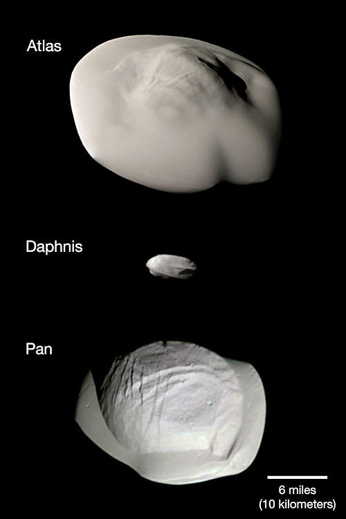 NASAのカッシーニ宇宙船の視界からのこのモンタージュ写真は、比較の容易さのために、同じスケールで、アトラス、ダフニス、パンの、土星の小さなリングの月の三つを示している。このモンタージュ写真では、アトラスとパンの二つの違いが明らかである。パンの赤道の帯は非常に薄くまた鋭く、アトラスの滑らかな赤道の帯の下の部分の中央の物質はパンのそれより小さく見える。この、赤外線、緑、紫外線フィルタを使ってとられたアトラスとパンのイメージは、人間の目には見えない月の表面全体の微妙な色の違いに焦点を当てる拡張されたカラーの視界をつくるために結合された。これらのイメージの全てはカッシーニ宇宙船の狭角カメラを使ってとられた。アトラスのイメージは2017年4月12日に 16,000 キロメートルの距離から、 パンのイメージは2017年3月7日に 26,000 キロメートルの距離から、ダフニスのイメージは2017年1月16日に 28,000 キロメートルの距離からとられた。全てのイメージは北が上になるように調整されている。
