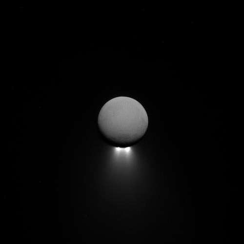 月自身は土星照を反射して柔らかく輝き、エンケラドゥスの興味深い南極のジェットが、日光によって背後から照らされて遠くから見られる。様々の形状でとられるジェットの観測は、これらの注目に値する地形に対して異なる洞察を提供している。カッシーニは、この月の氷の地殻の下に潜む地下の海のミステリーを解く期待で豊かな情報を集めてきた。この視界は差渡し504キロメートルのエンケラドゥスの土星に面する半球を見ている。北は上である。このイメージは、エンケラドゥスから約 808,000 キロメートルで、2017年4月13日に、カッシーニ宇宙船の狭角カメラの可視光線でとられた。イメージスケールはピクセル当たり5キロメートルである。