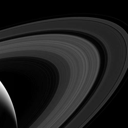 暗い帯のような手前全体の向こうに氷のリングが伸びる中で、NASAのカッシーニ宇宙船が土星の日の当たる大気の細片に向かって覗いている。この視界は、リング平面の下約7度から、リングの陽に照らされていない側を見ている。このイメージは、土星から100万キロメートルで、2017年3月31日に、カッシーニ宇宙船の広角カメラの緑でとられた。イメージスケールはピクセル当たり61キロメートルである。