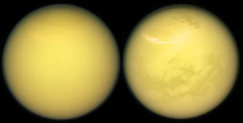 土星の月タイタンのこれらの二つの視界は、NASAのカッシーニ宇宙船が、この魅力的な世界の表面をどのように明らかにしたかを例証している。カッシーニは、タイタンを覆い隠す炭化水素の霞のベールを貫き通すために、いくつかの機器を運んでいる。これらには、宇宙船レーダー(PIA20021)と、可視光・赤外線マッピング分光計(VIMS:PIA13400とPIA18432)を含んでいる。このミッションの画像カメラには、また、表面への霞や暗い宇宙を通すことができる、赤外線の特定の波長に敏感ないくつかのスペクトルのフィルタを持っている。これらの「スペクトルの窓」は、ほぼタイタン全ての表面をマップする(PIA19658を見る)ための、画像カメラを可能にしている。タイタンの表面に加えて、画像カメラと VIMS からイメージは、この月の絶えず変化する大気の中の窓を提供し、長年にわたって霞と雲の外見と動きを年代順に記録した。夏の雲の大きく、明るく、羽毛のような帯が、右の視界の高い北を横断した弧として見えるだろう。これらの視界は、カッシーニ宇宙船の狭角カメラで、2017年3月21日にとられた。赤、緑、青スペクトルのフィルタを用いてとられたイメージが、自然色の視界をつくるために結合された。右側の疑似カラーの視界は、赤のチャンネルのために 938 ナノメートルの赤外線を代えることによって作られた。この視界は、タイタンから約 986,000 キロメートルから得られた。 イメージスケールはピクセル6当たりキロメートルである。