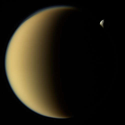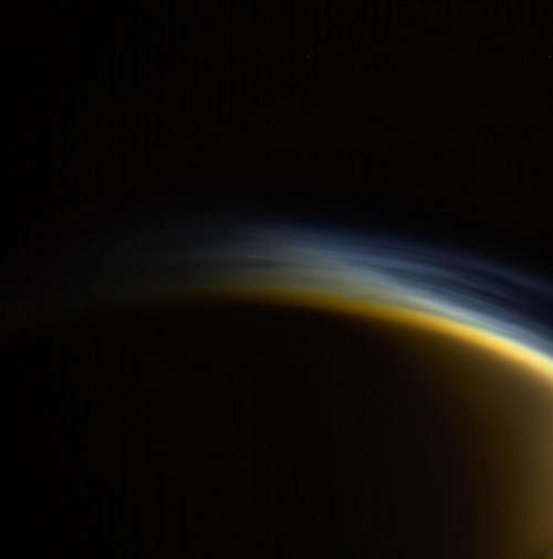 この視点では、霞の個々の層が、土星の最大の月タイタンの超高層大気に識別することができる。タイタンの大気はメタンと窒素から始まり、複雑な分子に発展し、最終的に月を囲むスモッグをつくる豊かで複雑な化学を形づくる。この自然色のイメージは、2005年3月31日に、タイタンから約 33,083 キロメートルの距離で、カッシーニ宇宙船の広角カメラの可視光線でとられた。この視界は月の夜の側の北極領域を見ている。タイタンの日の当たる三日月の一部が右側に見えている。