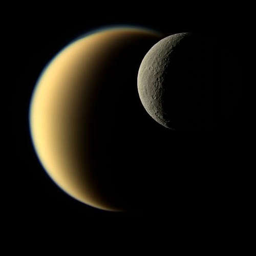 NASAのカッシーニ宇宙船によって見られたこの視点からは、土星の氷の月レアがタイタンの前を通過している。二つの大きな月のいくらかの違いが明らかである。レアが激しくクレータされ大気のない世界である一方、タイタンの窒素の豊かな大気は地球のものより厚い。この自然色イメージは、カッシーニの狭角カメラの可視光線で、2009年11月19日に、レアから約 1,148,000 キロメートルでとられた。