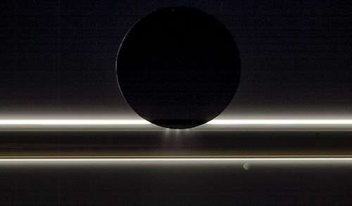 2009年11月1日にNASAのカッシーニ宇宙船によって捕えられたこの視界に、土星の月エンケラドスがリングの前に漂いまた小さい月パンドラがある。全体の光景は、二つのリングをつくる氷の粒と、差渡し約505キロメートルのエンケラドスの南極から発散しているジェットのために印象的な照明を提供し、太陽によって背景から照らされている。イメージがとられたとき、差渡し84キロメートルのパンドラは、カッシーニとエンケラドゥスからリングの反対側にあった。この視界は同様に差渡し81キロメートルのパンドラの夜の側を見ており、土星から反射する薄暗い金色の明りで照らされている。この自然色のイメージは、カッシーニ宇宙船の狭角カメラの可視光線で、エンケラドゥスから約 240,800 キロメートル、パンドラから 566,800 キロメートル離れたところでとられた。