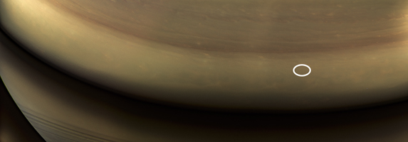 土星のこの視界は、リングから反射される日光によって照らされている惑星の夜の側を見ている。カッシーニのカメラで捕えられた最後のイメージのいくつかのこの合成は、宇宙船が何時間か後に惑星の大気入る場所を示している。大気入りの場所には卵形で印をつけてある。その時このエリアは惑星の夜の側であるが、次第に昼光に回転し、カッシーニは、土星での注目に値する13年間の探検を終えて、土星の超高層大気に最終的なダイビングを行った。赤、緑、青のスペクトルフィルタを用いてとられたこのイメージは、この場面を自然色に近く示すように結合された。このイメージは、2017年9月14日に、土星から約 634,000 キロメートルで、カッシーニの広角カメラでとられた。