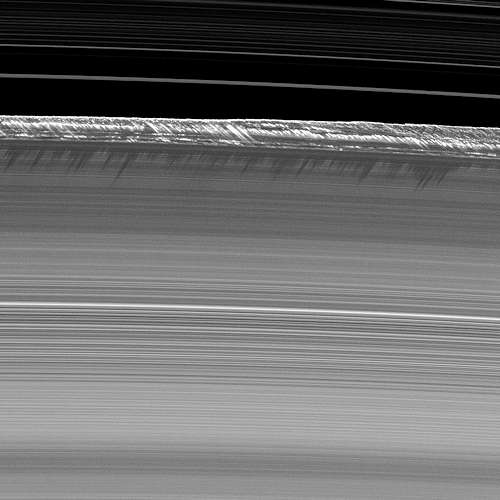これらのけば立ったピークは、土星のメインリングに見られる最も高い部分であり、通常は僅か10メートルほどである惑星のメインリングの垂直の厚さからかなり偏っており、リングの平面より 2.5 キロメートルほど高くそびえている。このイメージで長い影を投げるように、それらは、Bリングの端から急に立ち上がっている。しかし、これらの山脈は固体からは遠く、それらは、小さな月達の重力とリングで誘発される波に似た構成に応じて、リングの粒の蓄積を絶えず変化させている。BとAリングの間のカッシーニの間隙の部分がイメージのトップに現れ、より内部にリングレットを示している。これは、Bリングの外端の一つの際立った領域であり、そこではキロメートルあるいはそれ以上の小さな月が発見される。これらの天体達は、それらを通り越して流れるリングの素材に顕著に影響を及ぼす可能性がある。このようなイメージは土星の昼夜平分時ごろ可能であり、