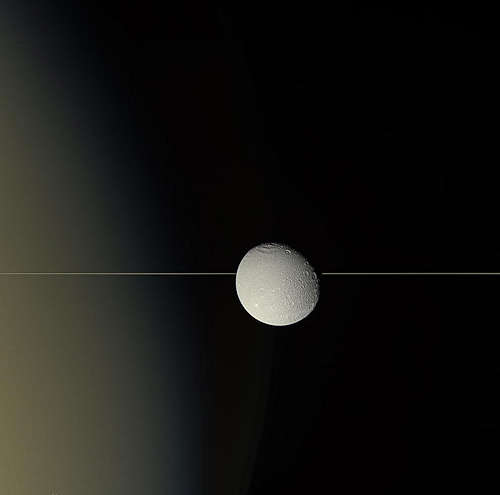 カッシーニは、2012年7月23日に、土星の月ディオネのこの印象的な視界を捕えた。ディオネは差渡し約 1,123 キロメートルである。その密度は、この月の約3分の一が密度の濃いコア(恐らくケイ酸塩岩)から成り、その素材の残りが水の氷であることを示唆している。ディオネの平均温度は摂氏 -186 度であり、氷は非常に硬く岩のようである。このイメージは、カッシーニの狭角カメラの分極フィルタと緑のフィルタによって、ディオネから約 418,000 キロメートルからとられた。
