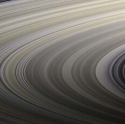 NASAのカッシーニ宇宙船によって2009年8月22日にとられた土星のリングが、この視点からは微妙な色を示している。リングを構成する粒は、大きさにおいて砂粒より小さなものから山ほどの大きさのものまでの幅があり、大部分は水の氷でできている。リングに色を与える素材の正確な性質は、科学者達の間の激しい議論の種として残っている。 この自然色視界をつくるために、赤、緑、青のスペクトルのフィルタを使ってとられたイメージが結合された。カッシーニの狭角カメラは、リングの中央から約205万キロメートルの距離でこのイメージをとった。