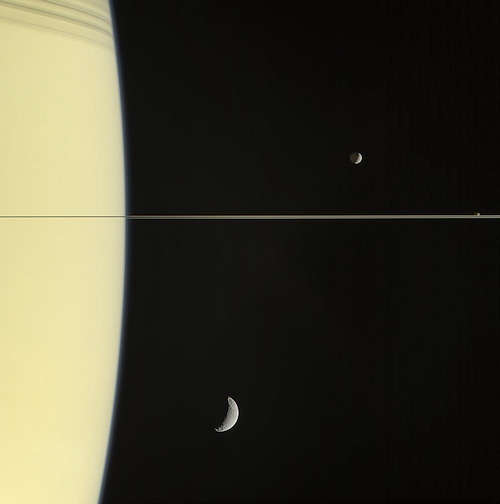 2006年3月13日に、カッシーニの狭角カメラは、ほぼエッジオンで見られる土星とそのリングのこの観察を捕えた。このフレームには、また、ミマス(上)、小さなヤヌス(リングの上)、テチス(下)を撮っている。三つ全ての月達とそのリングは、大雑把に同じ平面で土星を周っている。ミマスの夜の側は「土星照」によって穏やかに照らされ、惑星の雲のトップからの光が反射している。この自然色視界をつくるために、土星から約270万キロメートルでとられた、赤、緑、青のフィルタでとられたイメージが結合された。
