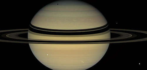 NASAのカッシーニ宇宙船からの2007年12月6日のこの視界に、土星の表面を通して2種類の劇的な影が見える。惑星のリングが北半球の雲のトップに暗い帯を投げている。中央左の明るい球、土星の月テチスからの細長い影を極の近くに見ることができる。他の氷の月、ディオネ(正面右)とエンケラドゥス(右後ろ)が同様に姿を現している。土星の南半球の明るい嵐を右下に見ることができる。この自然色の視界は、赤、緑、青のフィルタを使ってとられたイメージの合成である。このイメージは、土星から約170万キロメートルで、カッシーニ宇宙船の広角カメラで得られた。
